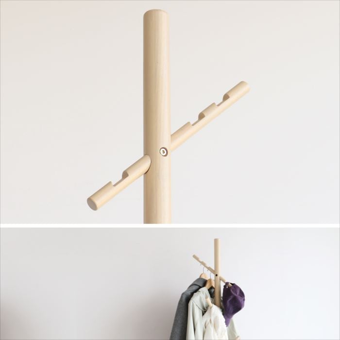 子どもも大人も使える2wayポールハンガー。まるでオブジェのように美しい佇まいで、斜めに伸びるフックとすらりとした支柱が、無駄のないスタイリッシュなフォルムを生み出しています。3本のフックをそれぞれ違う方向に設定しているので、重ならずスッキリ収まる構造に。