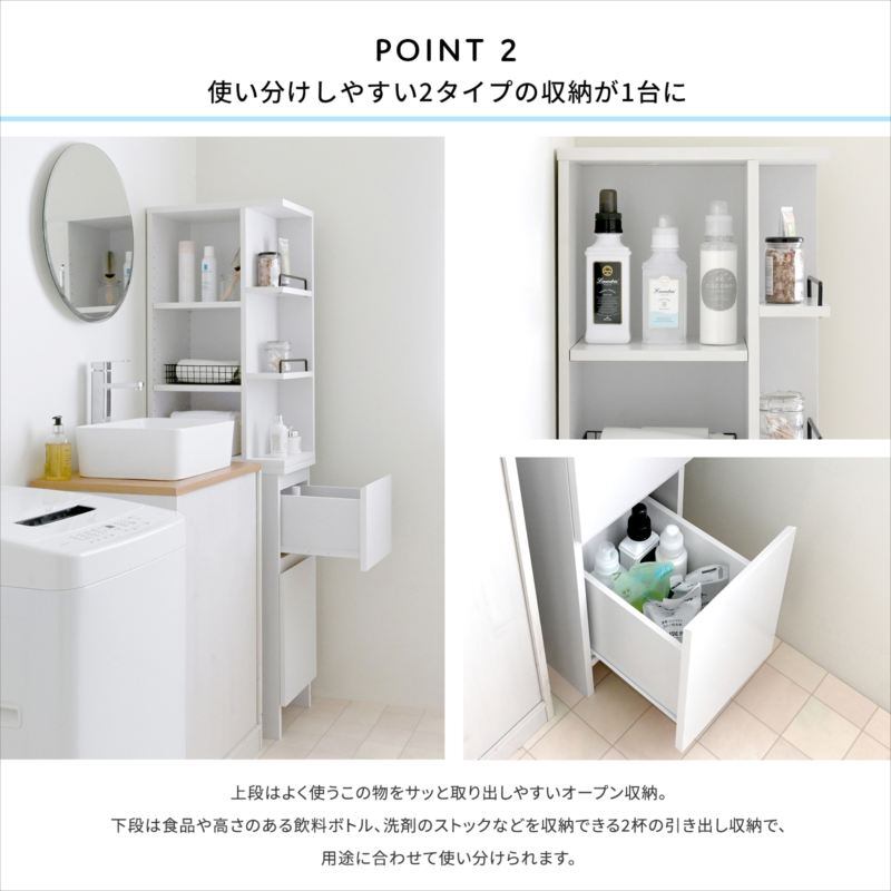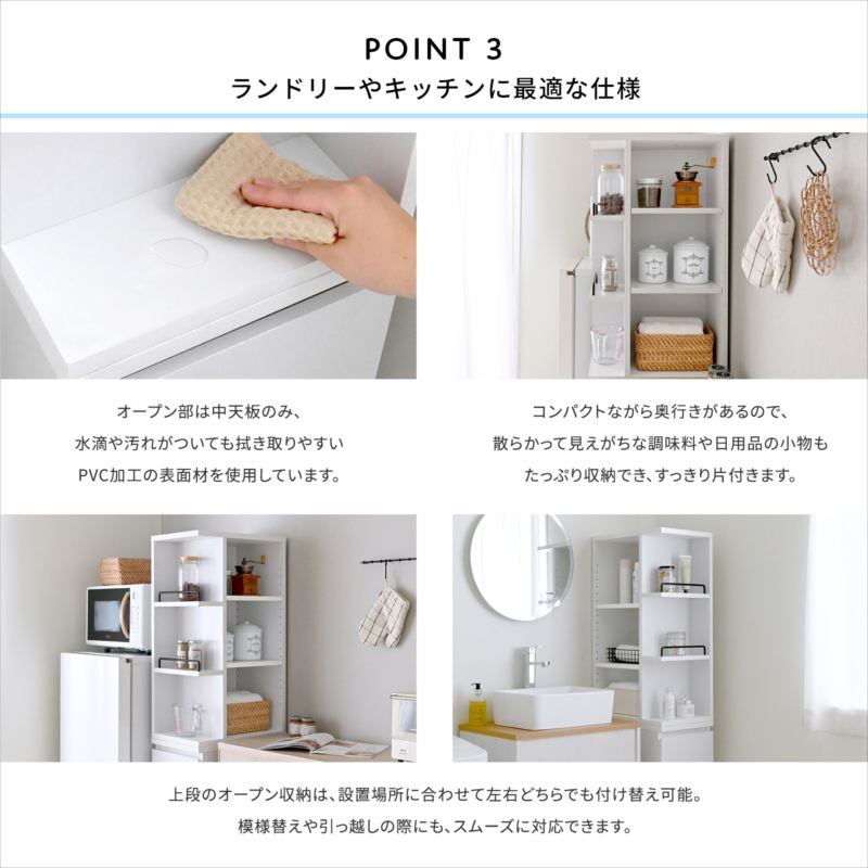 洗濯機周りやキッチンなどのちょっとした隙間を有効活用できる隙間ラック。使い方によって、オープンラックとキャビネット、上下分けて使用できます。上段のオープン収納は設置場所に合わせて左右どちらでも付け替え可能です。