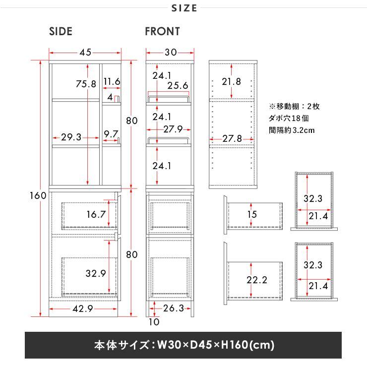 ●内寸:[オープン部固定棚]W279×D116×H241mm×3カ所[オープン部移動棚]W278×D293×H758mm[引出し 小]W214×D323×H150mm[引出し 大]W214×D323×H222mm[脚空間]W263×D429×H100mm
