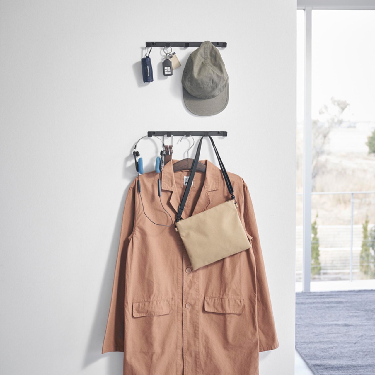 石こうボードピンで壁面に簡単取り付けできるウォールフック5連。持ち物が多いお子様の学用品や制服などを1か所にまとめて準備すれば、忘れ物防止にも。複数使用して、きょうだいそれぞれのお片付け場所としても。厚みが3cmと薄いので省スペースで設置できます。石こうボードピンで穴跡を目立たせずに、リビングや玄関などに設置できます。木ネジでも取り付け可能。