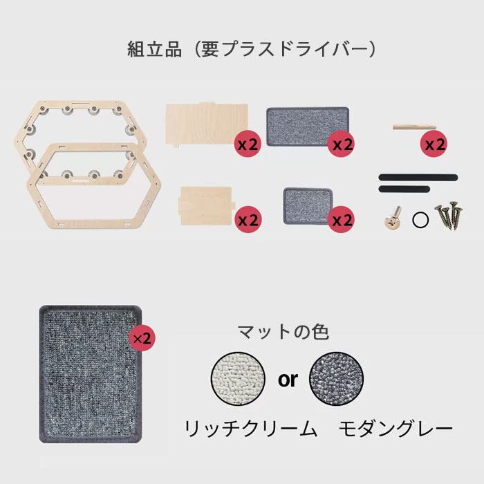 組み立て方次第で自由なルートを作れるアイテム。シンプルなステップと組み合わせてキャットウォークにアスレチック要素をプラスできます。