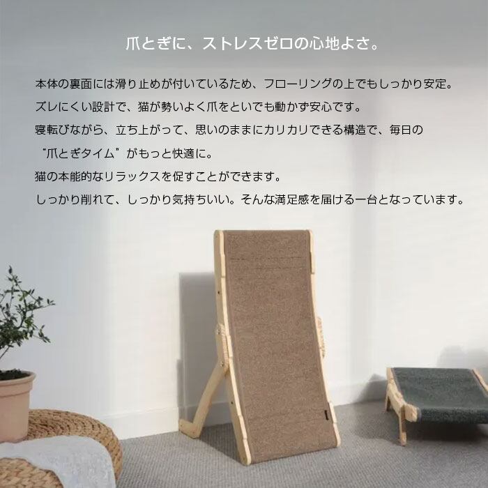 爪とぎもできるスワンカーペットを使用したしっかりとした生地で、くつろぎながら気軽に爪とぎが可能。