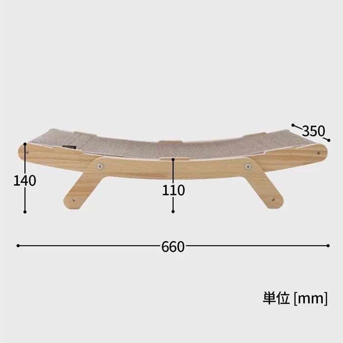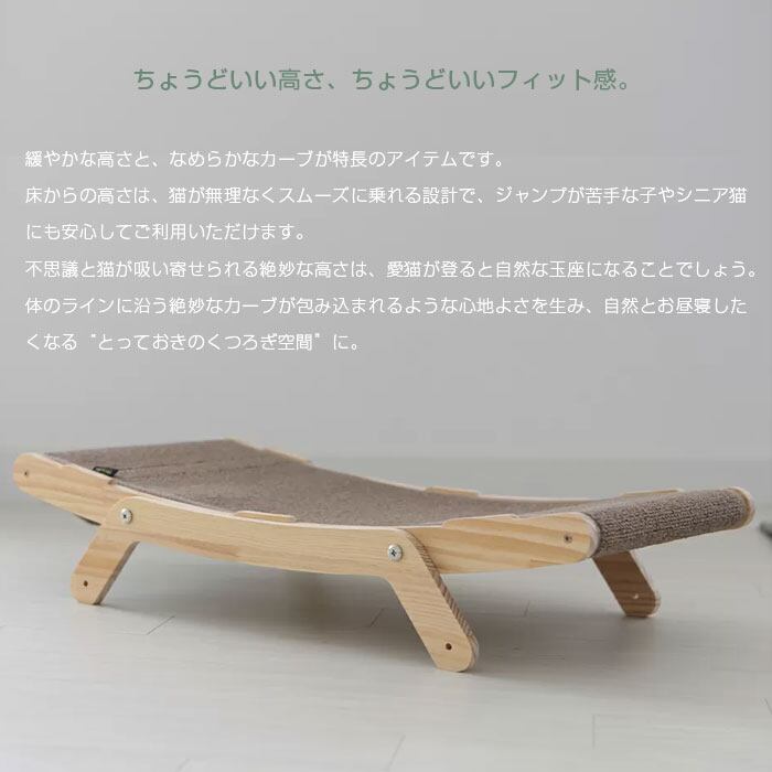 ゆるやかなカーブが身体にやさしくフィットし、寝転ぶ・丸まる・伸びるといった猫本来の動きを自然に受け止めます。
