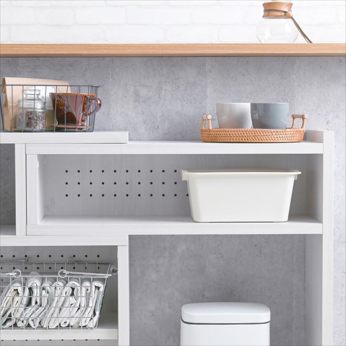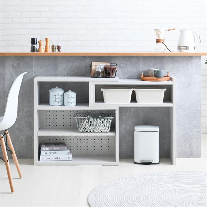 置きたいスペースにフィットする伸縮ラック。キッチンカウンター下や空いたスペースに合わせて設置でき、自由なレイアウトをお楽しみいただけます。