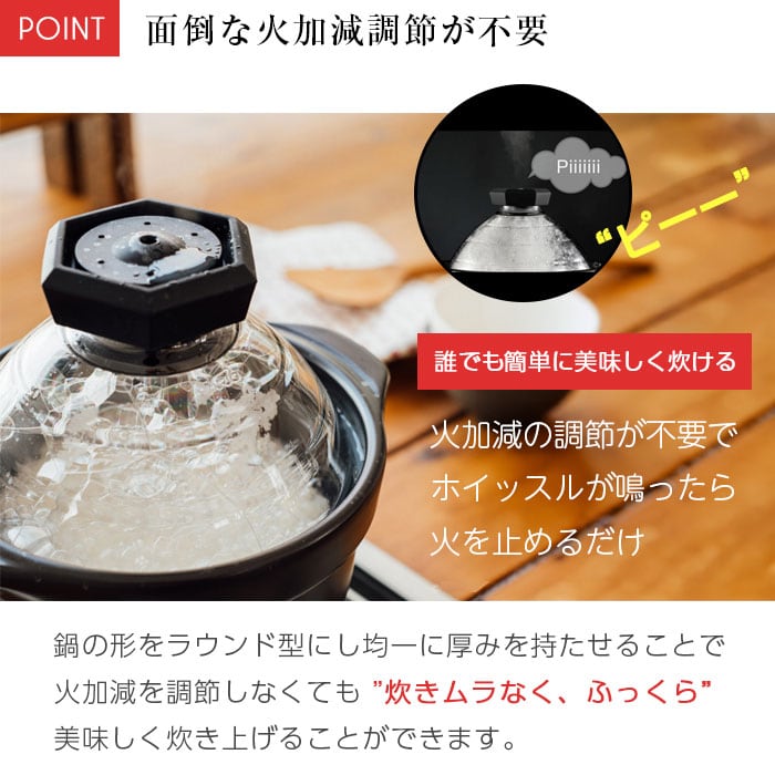 鍋の形状をラウンド型に、肉厚を均一に厚みを持たせることで、火加減調整をしなくても炊きむらなく、ふっくら美味しく炊き上げることが出来ます。
