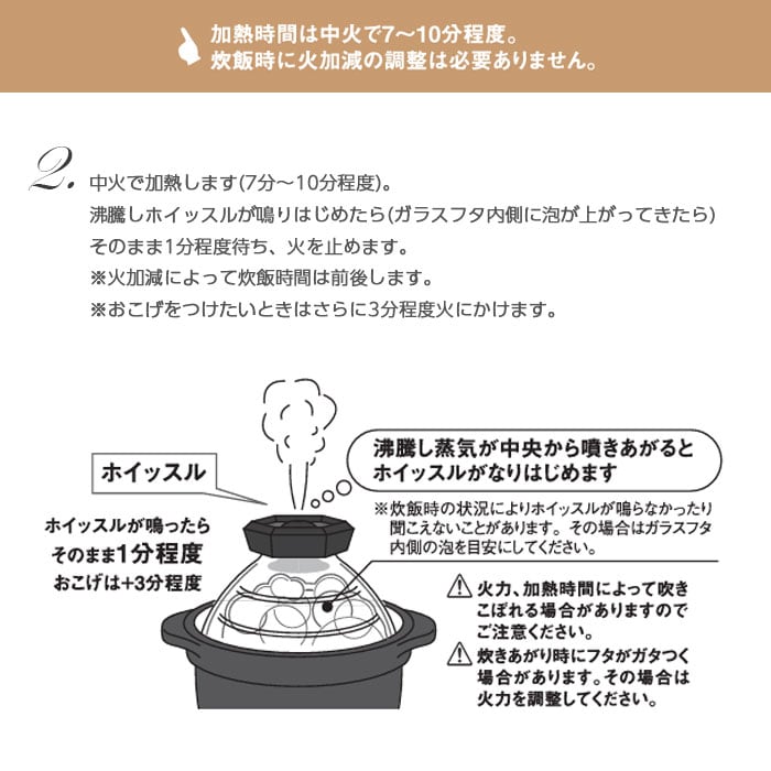 【耳】で聞く合図: 炊き上がりをピーッ!とホイッスルでお知らせ。タイマーも、コンロに張り付く必要もありません。