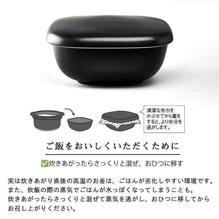 炊きあがったご飯をおひつに移しかえると、陶器が余分な水分を吸収し粒立った美味しいご飯になります。