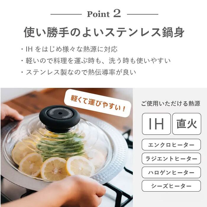 商品スペック&嬉しいポイント、特長の透明なガラス蓋調理プロセスが丸見え!