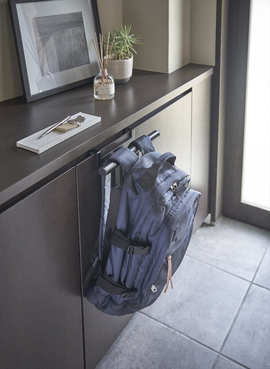 玄関の下駄箱収納扉に簡単取付け。便利なランドセル&リュックハンガー!用途に合わせて使い方自在。 下駄箱収納扉に差し込むだけで簡単に取り付けできます。リュックやランドセルをしっかり掛けられる丈夫なスチール製のハンガー。 ハンガーは雨具や傘などの一時掛けにも便利です。