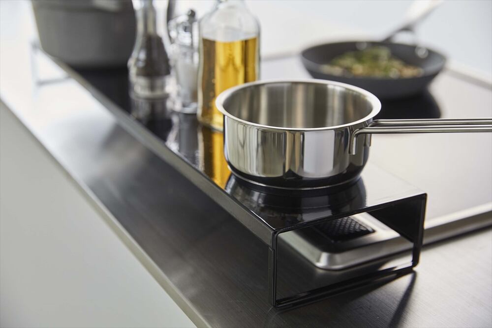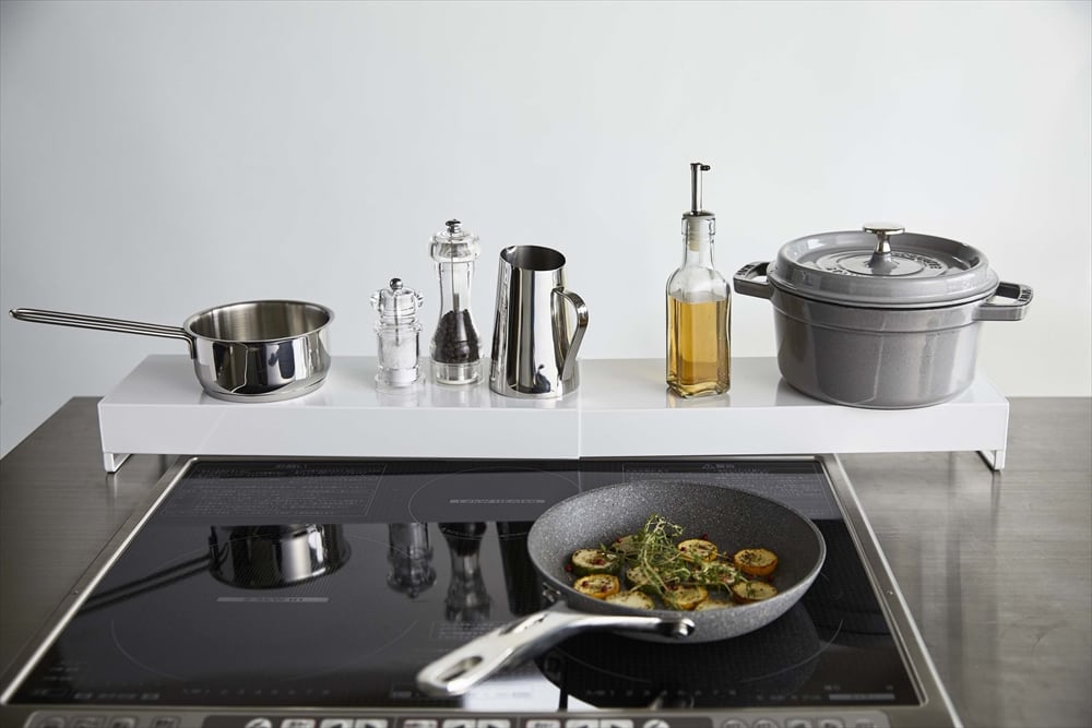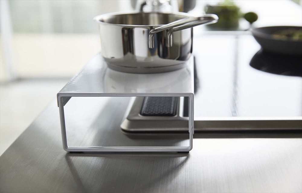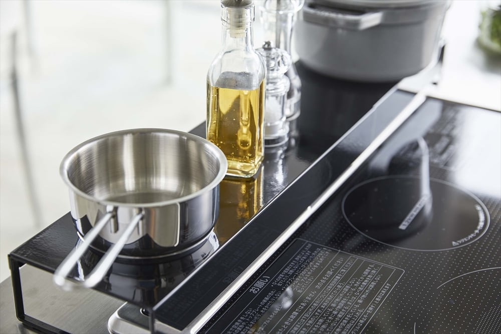 スパイスや調味料はもちろん、鍋やフライパンが一時置きできる。 奥行がワイドな排気口上カバー。 IHクッキングヒーターやビルトインガスコンロの排気口に飛び散る油はね・調理くずなどの汚れを防止するためのカバーです。排気口に飛び散る油はね・調理くずなどの汚れをしっかりガード。 鍋やフライパンの一時置きに。