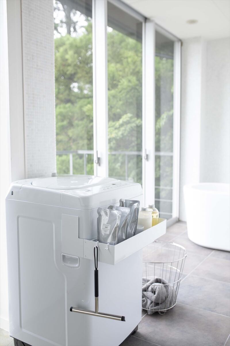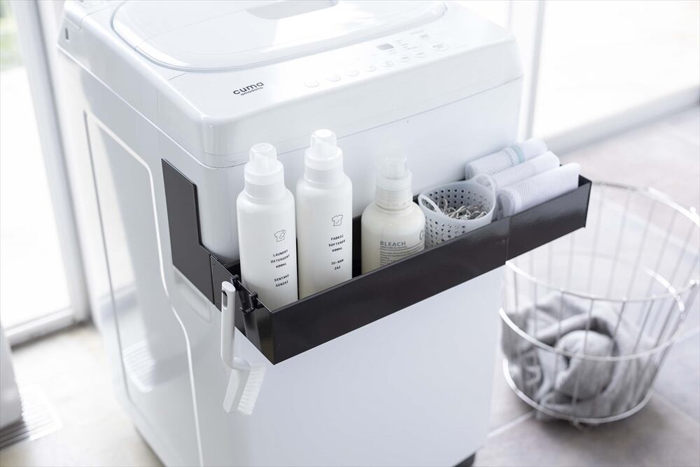 マグネットで洗濯機の側面から挟み込むだけの簡単取り付けラック!伸縮できるから洗濯機のサイズに合わせて調整できます。2個同時に使用すれば収納力もUP!付属のフックでブラシなどの小物も収納可能。洗剤ボトルや洗濯ネットなどを洗濯機の手前に収納できるから洗濯作業がスムーズ!シャンプー・コンディショナーなどのバス用品のストックの収納としても便利!