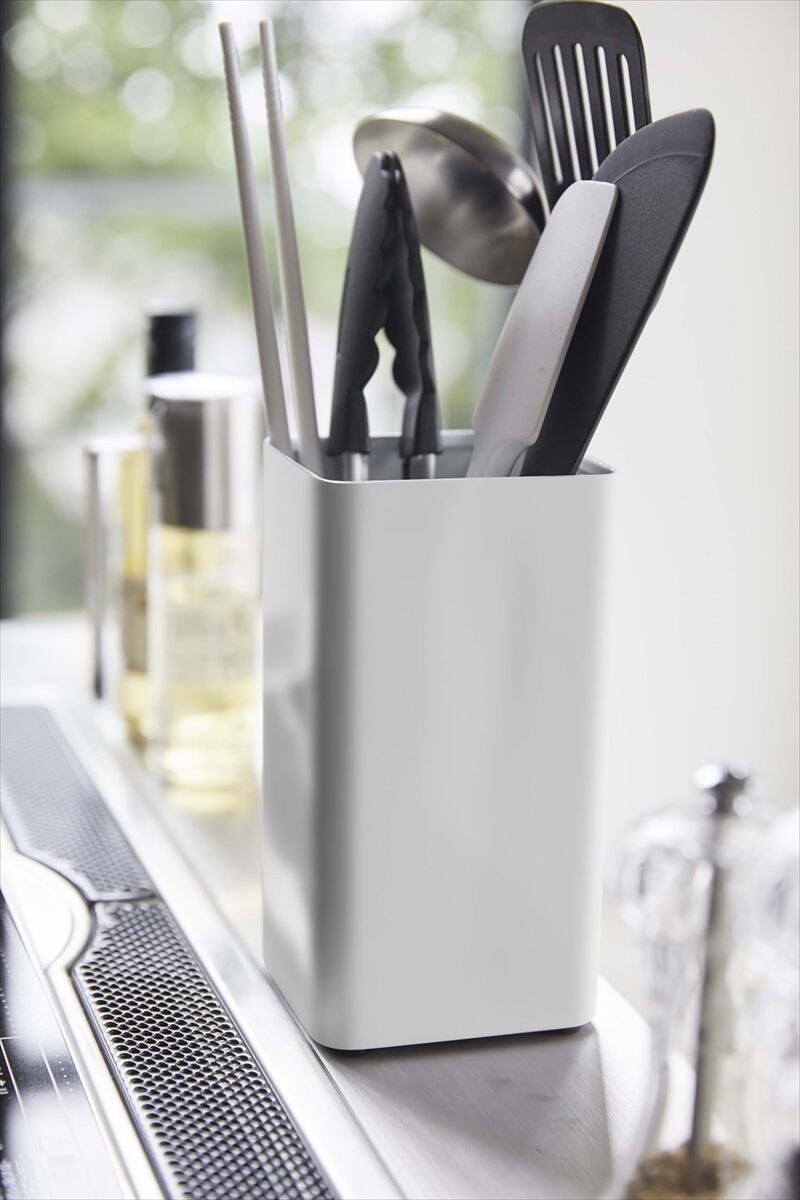 四角い形状で安定感がよく、コンパクトなのに大容量のキッチンツールスタンド。 狭いコンロまわりでも収まりのよい四角い形状。よく使う調理ツールをたっぷり収納可能。底面はシリコーンマット付きで、取り外してサッと洗えます。