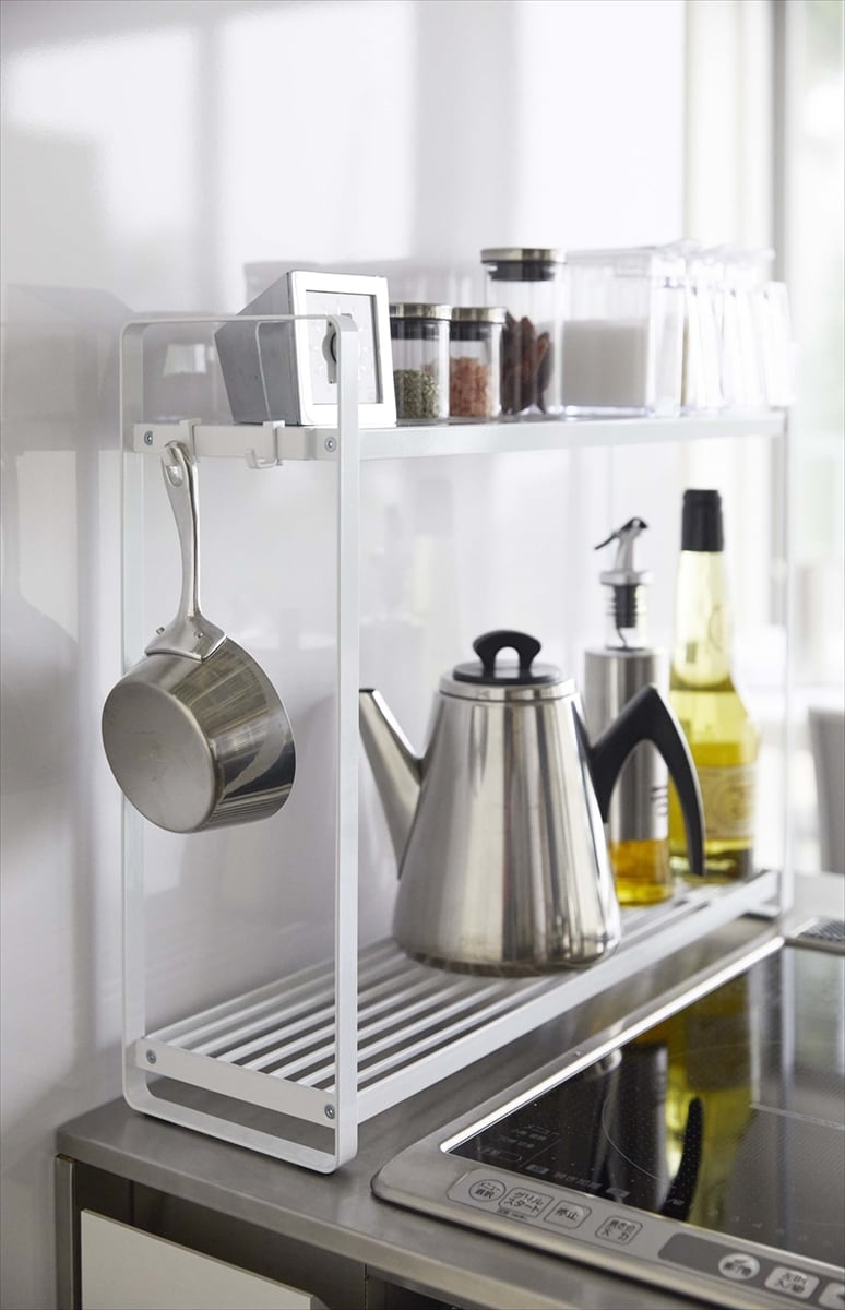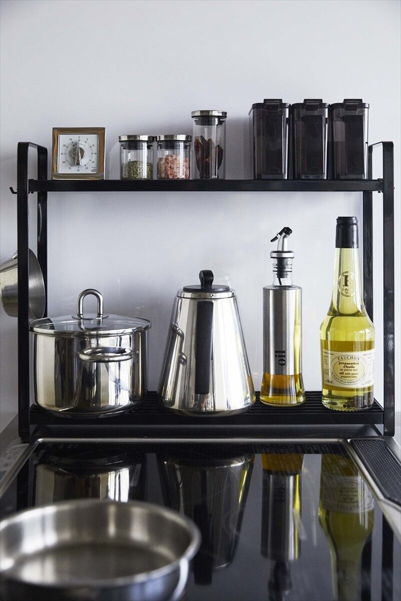 調味料ストッカーやキャニスター、鍋やケトルまで一括収納できる便利な2段棚のコンロ横ラック! 奥行約14cmだからコンロ横にスッキリ収まるサイズです。見た目もシンプルなデザインです。 上段棚:平らになっているので、細かいものを収納できます。 下段棚:ケトルやお鍋、調味料ボトルやオイルなど大きめのものや高さのあるものを収納しやすいように設計。