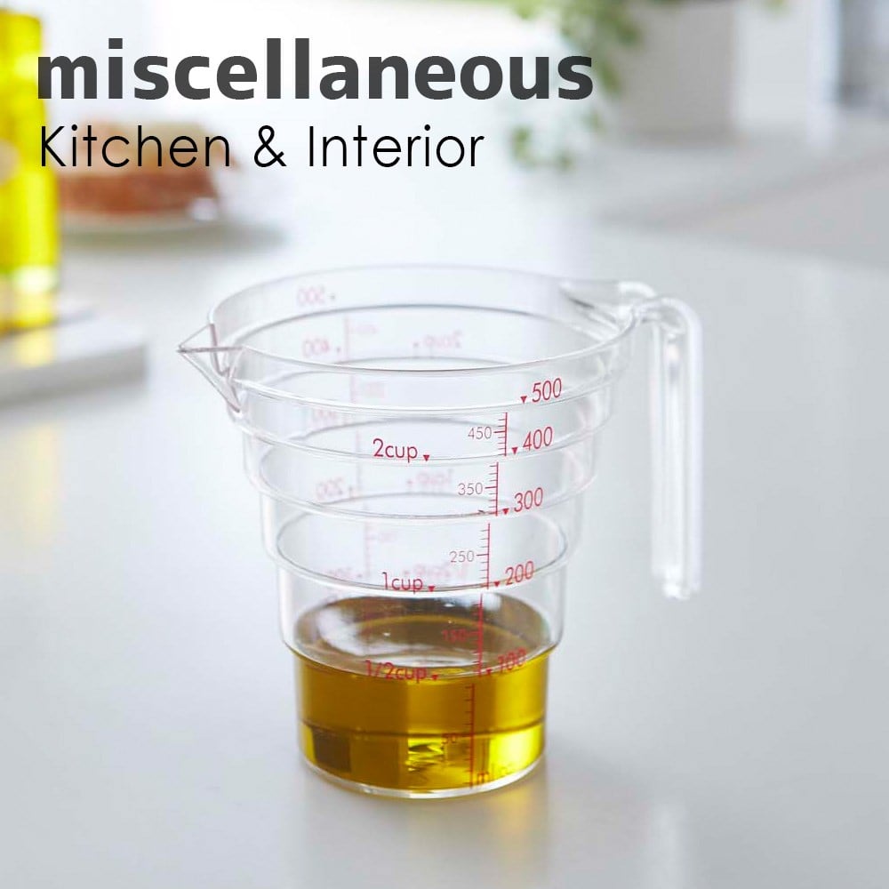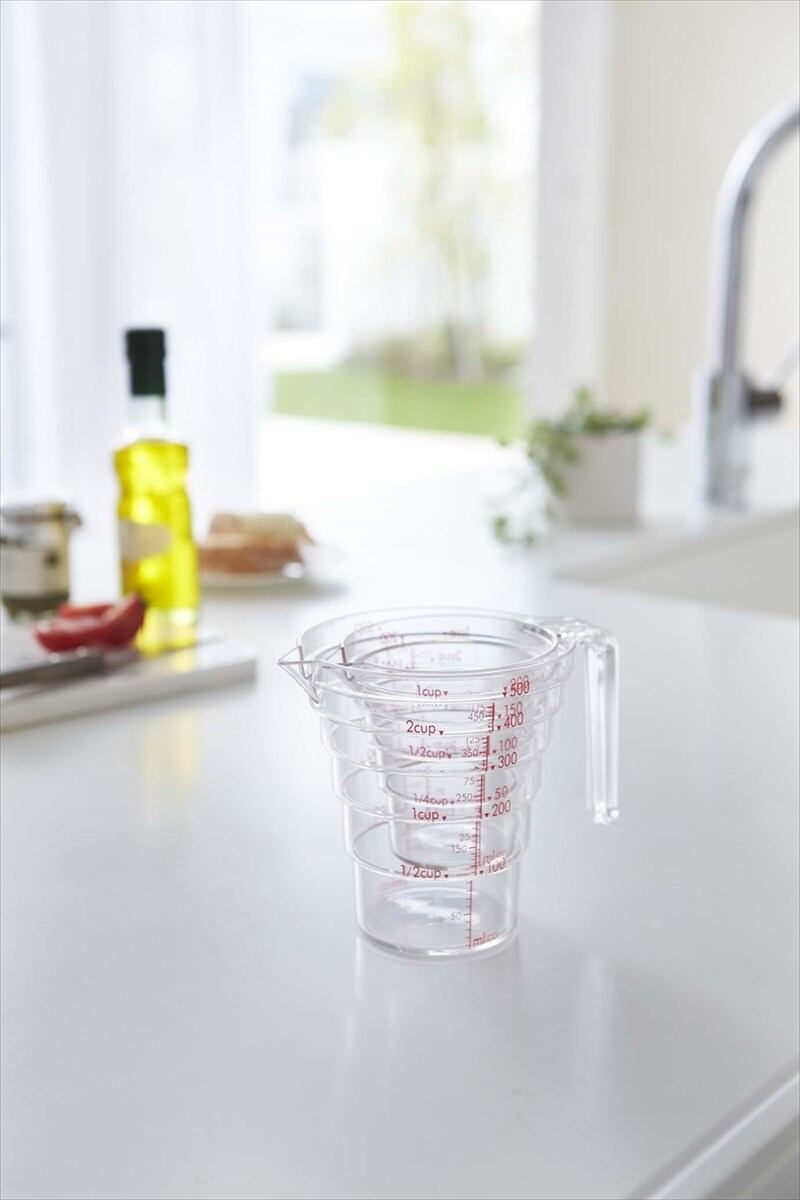 段差メモリで上から一目で簡単計量。熱に強く割れにくいトライタン樹脂製。200mlと500mlをスタッキングして収納できます。