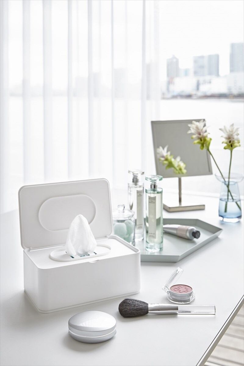 赤ちゃんのおしり拭きシートを収納できるケース。大判タイプの赤ちゃんおしり拭きシートをスタイリッシュに収納。市販の袋のままだと生活感が出て、置き場所に困りますが、このケースに収納すれば、お部屋の雰囲気を壊すことなく使えます。いたずら防止フタ構造、赤ちゃんの力では開けにくい硬さに設定。ペーパーストッパー付き。次のティッシュがスタンバイ。パウダールームに、デスク周りに、ダイニングに。