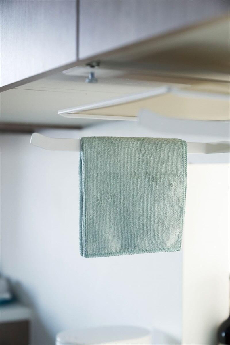 吊り戸棚に簡単取り付けのまな板収納ホルダー。置き場所に困るまな板を2枚収納可能!ハンガー部分で布巾も干せます。