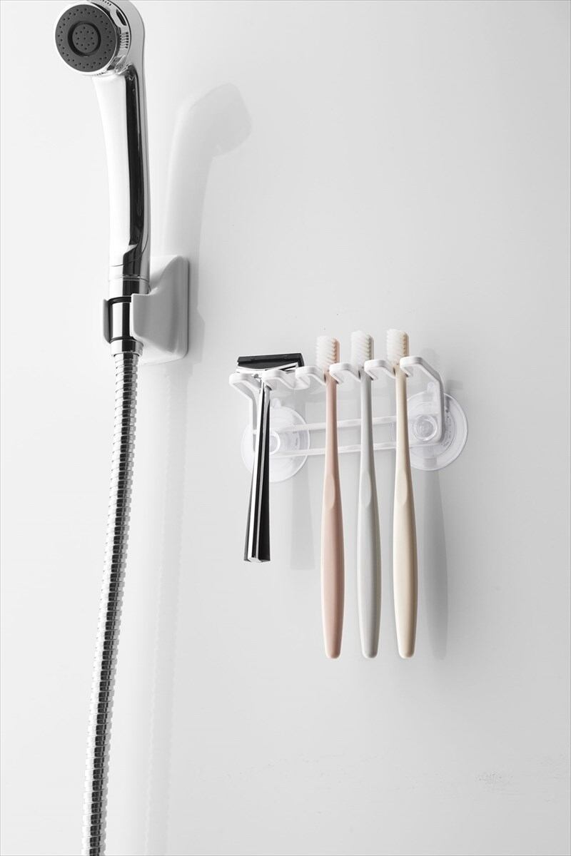 吸盤で洗面所に簡単取り付けの歯ブラシホルダー。歯ブラシを5本収納可能。替えの電動歯ブラシやバス小物の収納にも。歯ブラシを引っかけるだけの簡単ホルダー。