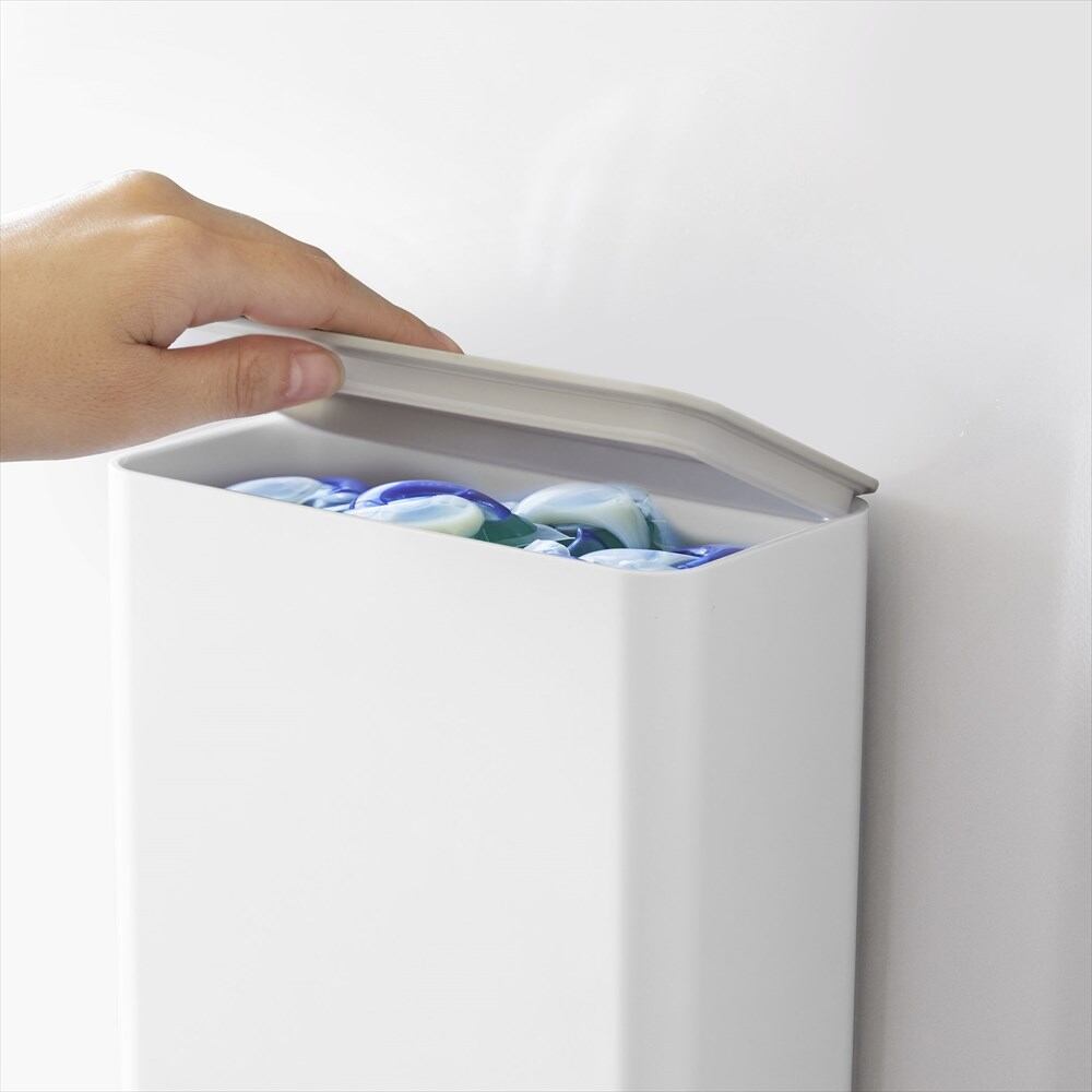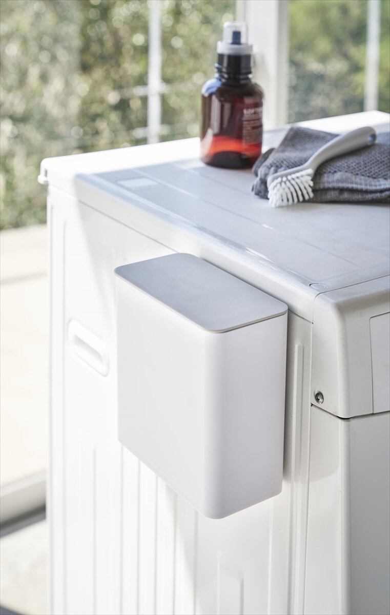 洗濯機横にマグネットで簡単取り付け。洗濯洗剤ボールをスッキリ収納。片手でサッと開けられます。パッキン付きでニオイもガード。洗濯ネットの収納に。洗濯粉末洗剤の容器として。洗濯バサミの収納に。ドラム洗濯機の上に直接置いても使えます。直接置けるのでコットンや綿棒など洗面所で出るゴミを捨てるのに便利。