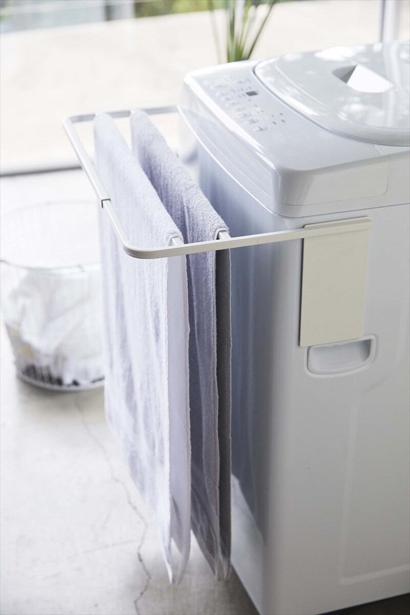 マグネットで洗濯機側の面に挟み込むだけの簡単取り付け!バスタオル・バスマットをスリムに干せます。使わないときはサッと取り付け替えれば邪魔になりません。 風呂上がりの着替えや洗濯カゴなどの一時置き棚としても。