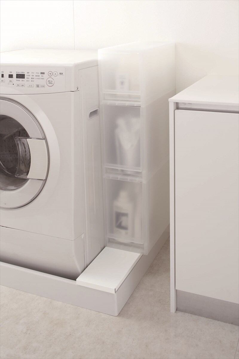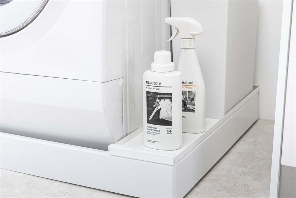 防水パンの上に置くだけでその上を有効活用できるラックです。洗濯機の排水口とホースを隠して埃もガード!表面と裏面の両面仕様だから収納するものや用途で変えられます!裏面で使用する場合はガードがあるから、洗剤ボトルやゴミ箱などの小物を置くのに適しています。表面で使用する場合はフラットなので、収納ラック