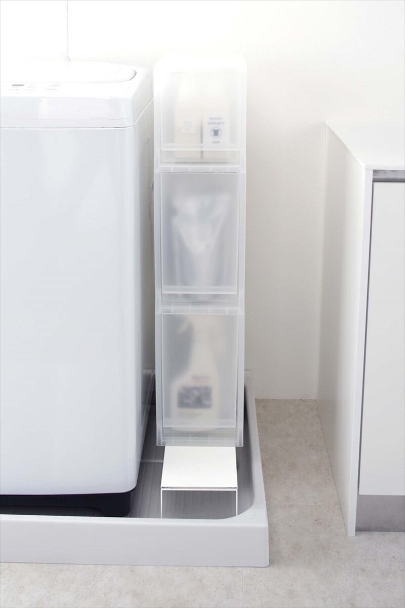 洗濯機の排水口とホースを隠しながら、その上を有効活用できる伸縮ラック。伸縮できるから洗濯機のサイズや防水パンの内寸サイズに合わせてサイズを調整できます。