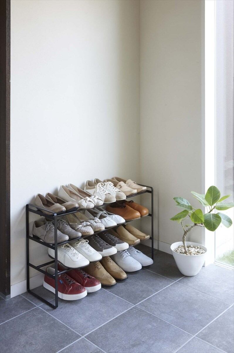 伸縮自在の3段シューズラック!玄関スペースや靴の量に合わせて横幅を調整可能!男性のシューズなら最大約12足、女性のヒールなら最大約16足収納可能!