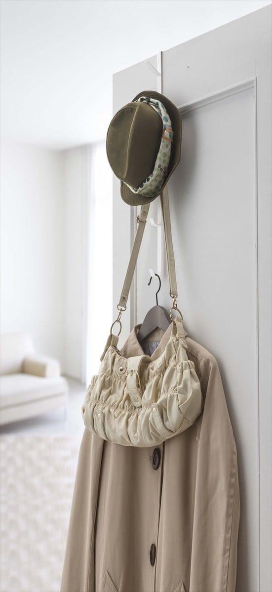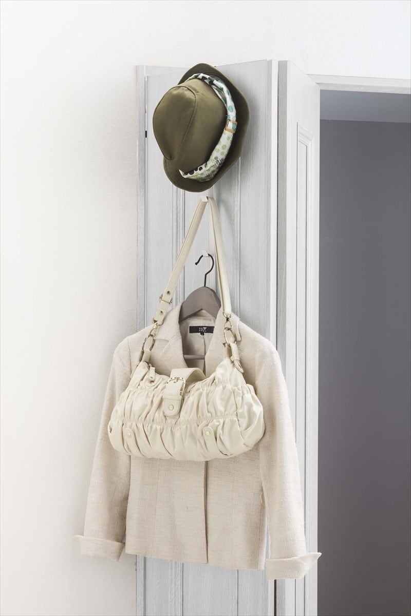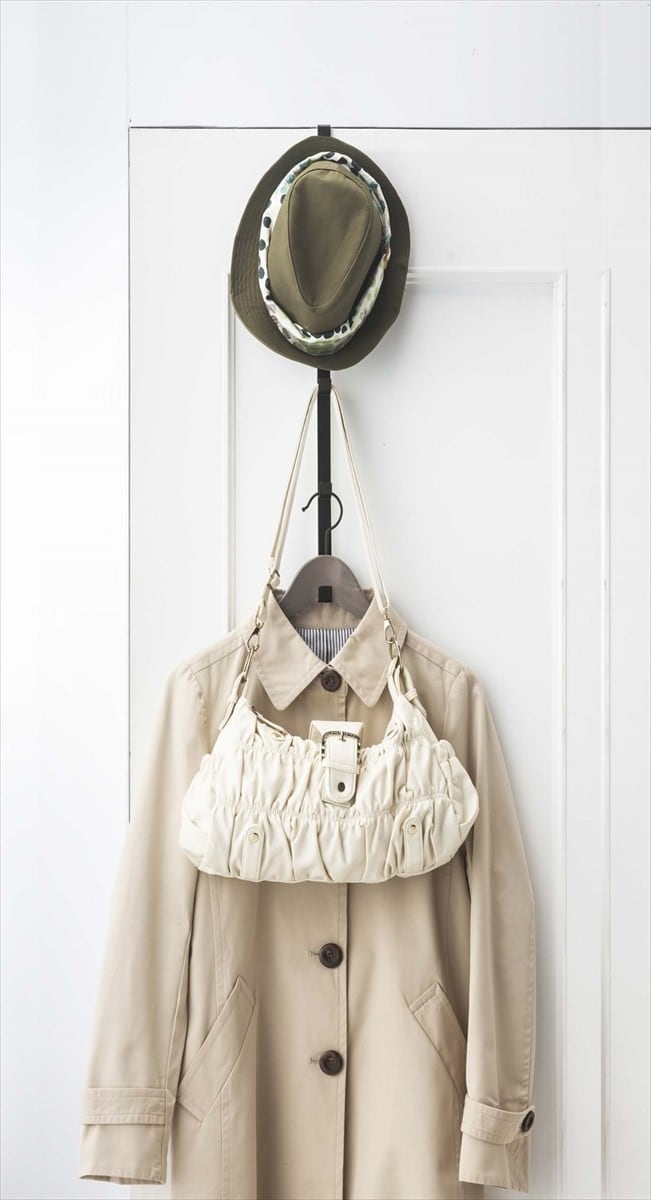 上のフックには大人の帽子とバッグなどを掛けると便利。ドアを有効活用! お出かけ前に