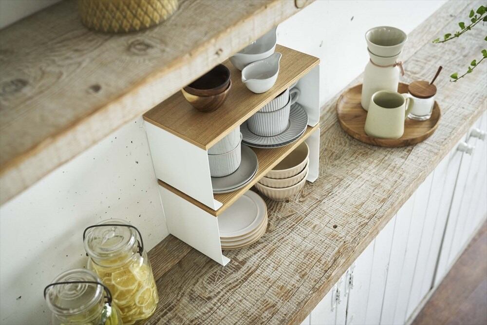 キッチントップや食器棚などに収納スペースをプラス出来る便利なコの字ラックです。横に並べればさらにすっきり収納することができます。2段までスタッキングして使用することができます。