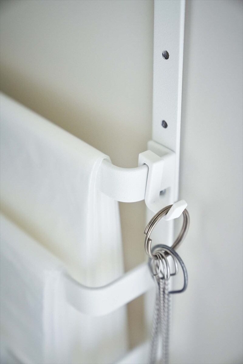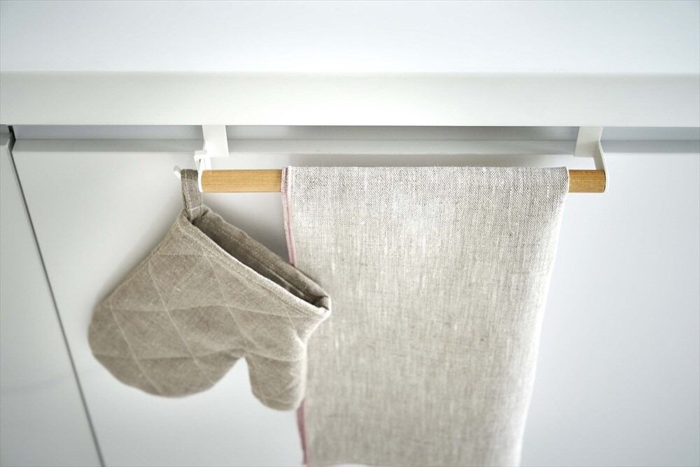 シンク扉に引っ掛けるだけの簡単取り付け。扉の外側にはタオルハンガー、扉の内側にはゴミ袋ホルダーが3段付いています。 高さが3cm間隔で調整でき、シンクの深さ約20cmまで設置できます。開き戸・引き出しの どちらにも対応。フックが4個付いているのでキッチン小物の収納にも便利です。付属のゴミ袋ホルダーは収納するものに合わせて上下どちらの向きでも取り付けできます。