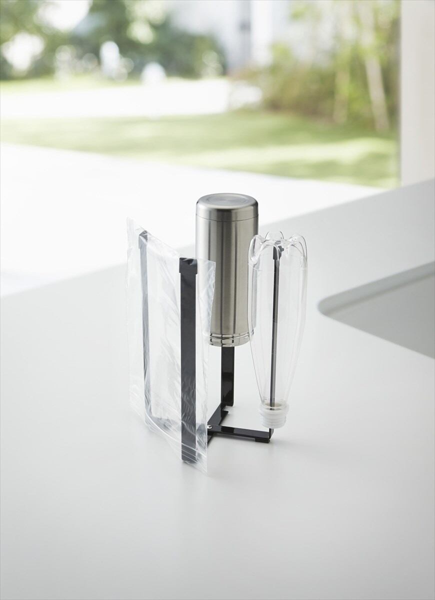 ポリ袋を掛けて調理中にでるゴミをその場でポイ!スーパーなどのポリ袋を利用して調理中にでる野菜クズや資源ゴミを、手軽に捨てることができます。食卓やデスク上のミニゴミ箱としても使えます。使わないときは折り畳んで収納。まな板・レシピ本・PCタブレット立てとしても使えます。チャック付き保存袋を立てれば、余った食材の移し替えがスムーズに!牛乳パック・ペットボトル・保存袋を乾かして何度もリサイクル!マグボトル・グラス・まな板・ナベ蓋スタンドとしても使えます。