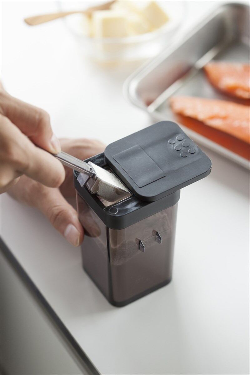 さらさらタイプの小麦粉やスパイスなどを簡単ふり掛け!小さじスプーンは容器に収納。小さじスプーン(5ml)付きで、すり切りも可能。片手で操作できるので調理もスムーズ。パーツはすべて分解して洗えるので、お手入れ簡単。使いたい量が片手で調節できる調味料保存容器。詰め替え用のさらさらタイプの小麦粉や塩コショウ・スパイス等をふり掛けられます。前後にフタをスライドさせ、分量を選んで出すことが