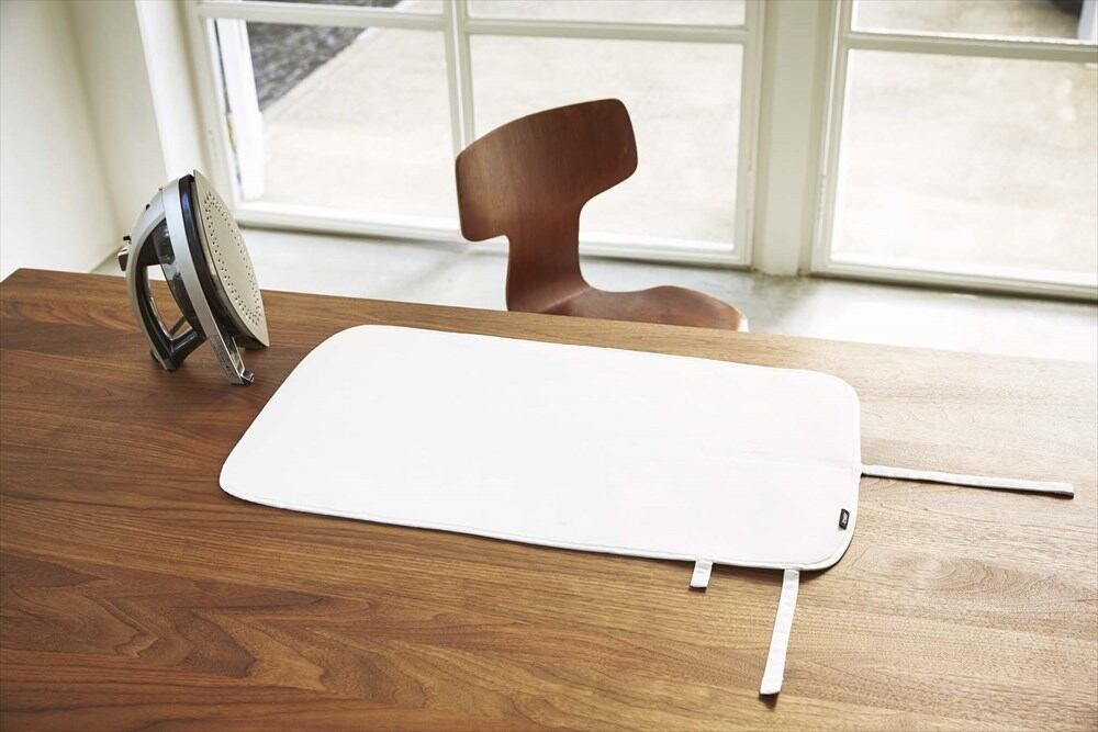 簡単に広げてアイロンマットに早変わり。アイロン掛け後は巻物のようにくるくる丸めて、面ファスナーで留めるだけの簡単収納!面ファスナーで留められるフックが付いているので、クローゼットのポールに直接ぶら下げられます。
