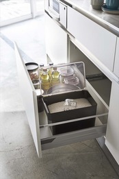 システムキッチンの引き出しに合うスタイリッシュな米びつ。パッキンでしっかり密閉され、お米が最後まできれいにすくえます。蓋をパチッとロックしておけば、お米を湿気と酸化から防いでくれます。炊飯器の横に置いておけば作業もスムーズ。蓋は全面が開くからお米がすくいやすく、残量が分かりやすい透明蓋。底の形が付属の計量カップにピッタリとフィットするから、残りのお米をきれいにすくい取ってくれます。