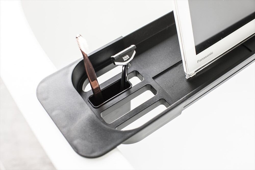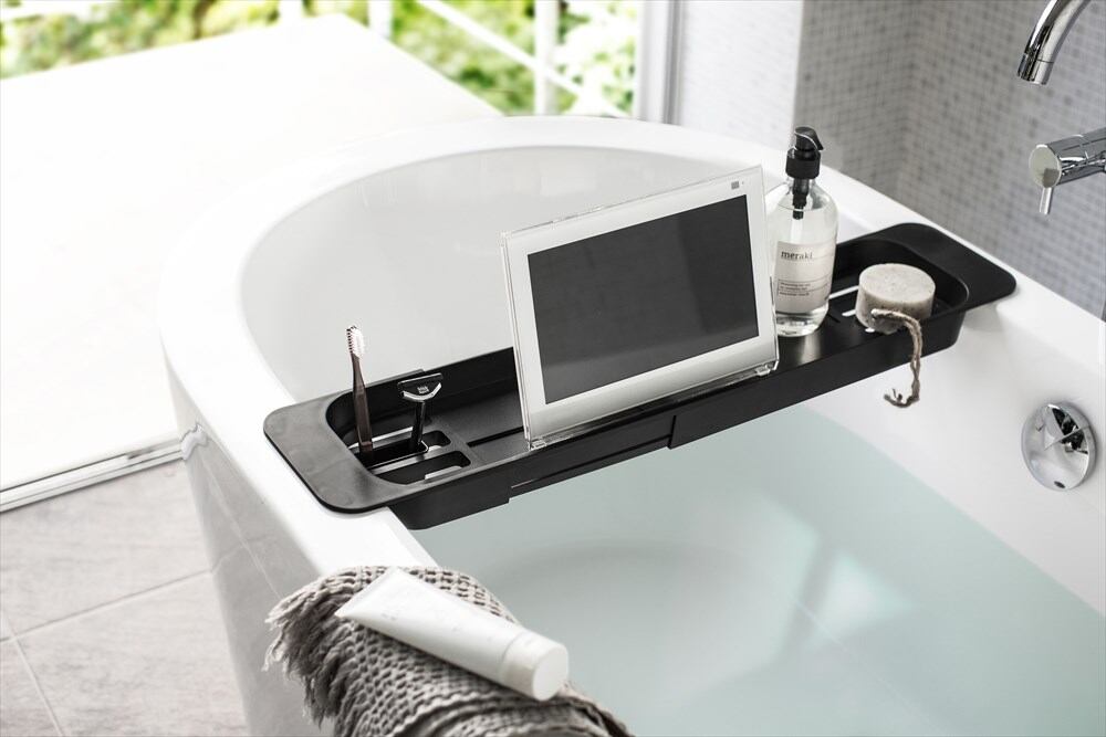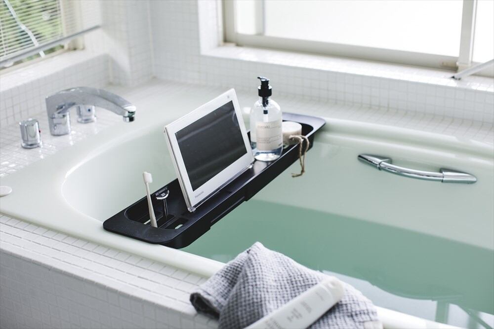 伸縮式で浴槽の縁にぴったりフィットのバスタブトレー。防水のTVやラジオやスマートフォンなどを持ち込めば、お風呂で音楽・映画鑑賞ができ、ゆったりくつろぎの時間を過ごせます。浴槽の幅に合わせて内容量も伸縮!裏面は滑り止め付きでしっかり安定。ケアグッズなどを立てられるポケット付き。