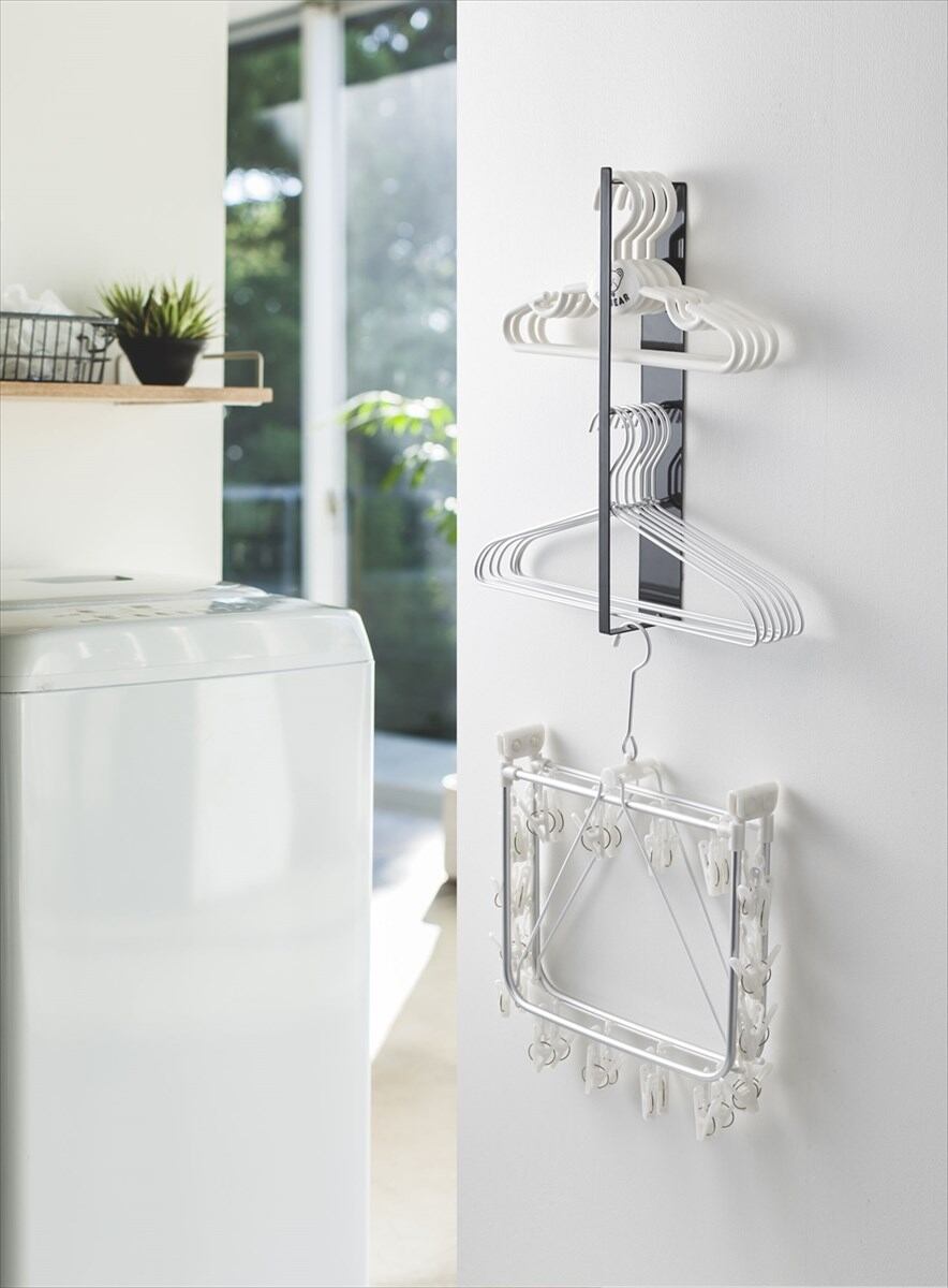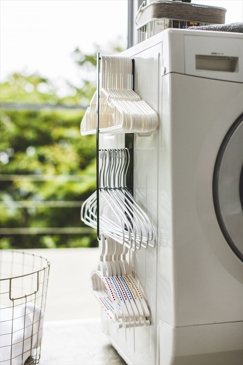 磁石で洗濯機横に簡単取付!かさばる洗濯ハンガーをスリムに一括収納!洗濯物をその場でハンガーに掛けられるから動作がスムーズ!取り出しやすく、使った後はスリムに収納。洗濯バサミも収納可能。横向き使用時にブラシなどを掛けられるフック3個付き。ピンチハンガー・お掃除ツールバスブーツの収納にも使えます。付属の木ネジで簡単取り付け。ランドリールームやクローゼットの壁面に。洗濯ハンガーを洗濯機横のすきまにスッキリ収納。