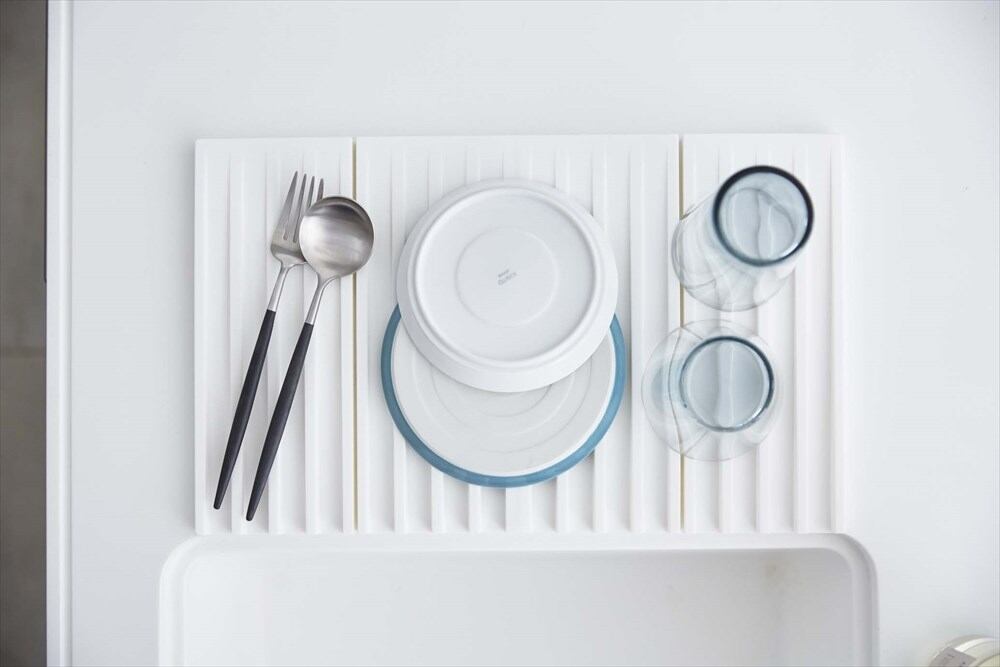 平らな面で食器を支えながら、切った水をそのままシンクに流せる水切りトレー。半分に折り畳めば鍋敷き、4つ折りにすればコンパクトに収納できます。フックに引っ掛けて収納できます。