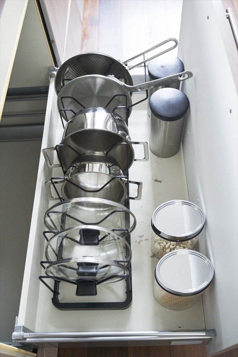 伸縮できるからシンク下のスペースに合わせてピッタリフィットするフライパン&鍋蓋スタンド!鍋やフライパンのサイズに合わせて仕切りパーツの位置は3cmごとに調整可能。持ち手が上になるから取り出しやすい持ち手置き付き!下に空いたスペースができるから収納力もアップします。