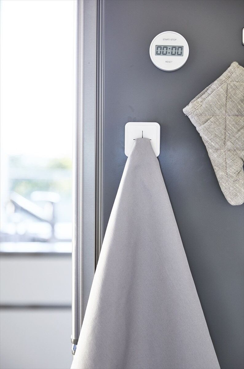 指で差し込むだけのタオルホルダー。冷蔵庫などにマグネットで簡単取り付け。タオルや布巾を指で差し込むだけ。
