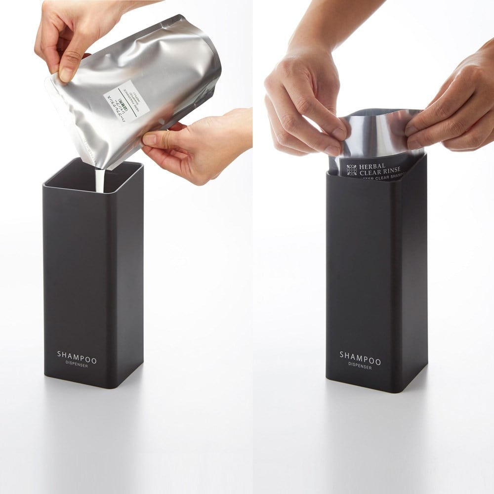 マグネットが付く浴室壁面に簡単取り付けのディスペンサーボトル。そのままポンプを押して液体を出せます。蓋が外れるのでお手入れや注ぐのが簡単。詰め替え用袋がそのまま入ります。