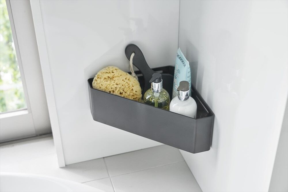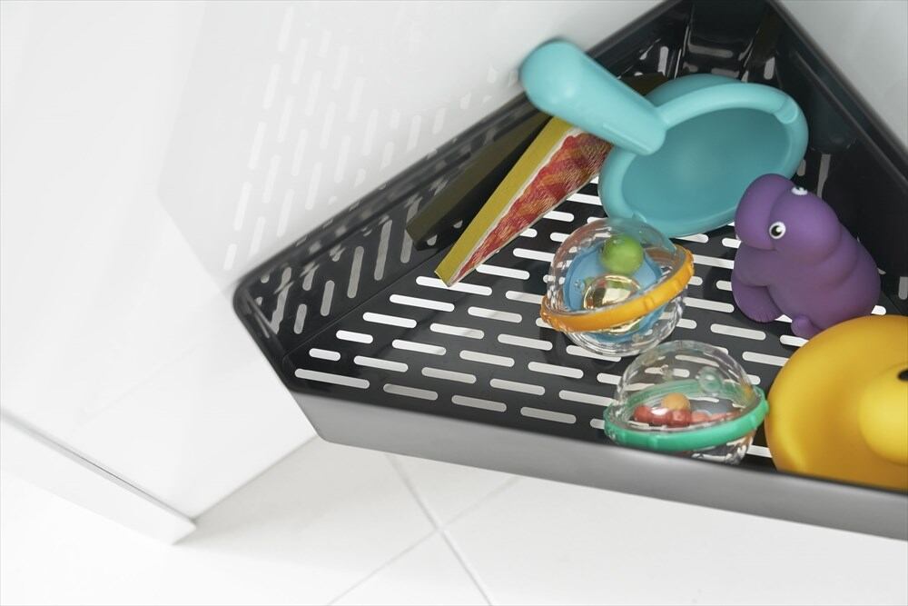 バスルームのコーナーにマグネットで簡単取り付けのおもちゃラック。ディスペンサー・洗顔チューブ・バス小物などの収納にも。水切れもしっかり!