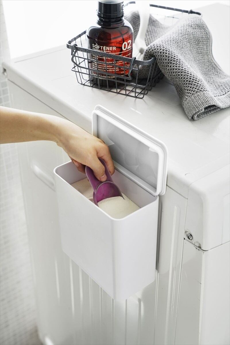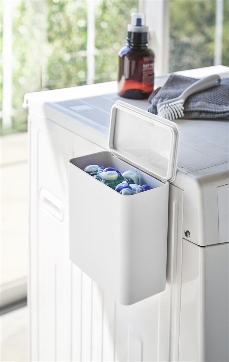 洗濯機横にマグネットで簡単取り付け。洗濯洗剤ボールをスッキリ収納。片手でサッと開けられます。パッキン付きでニオイもガード。洗濯ネットの収納に。洗濯粉末洗剤の容器として。洗濯バサミの収納に。ドラム洗濯機の上に直接置いても使えます。直接置けるのでコットンや綿棒など洗面所で出るゴミを捨てるのに便利。