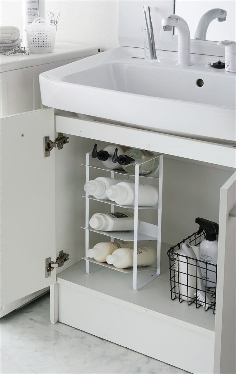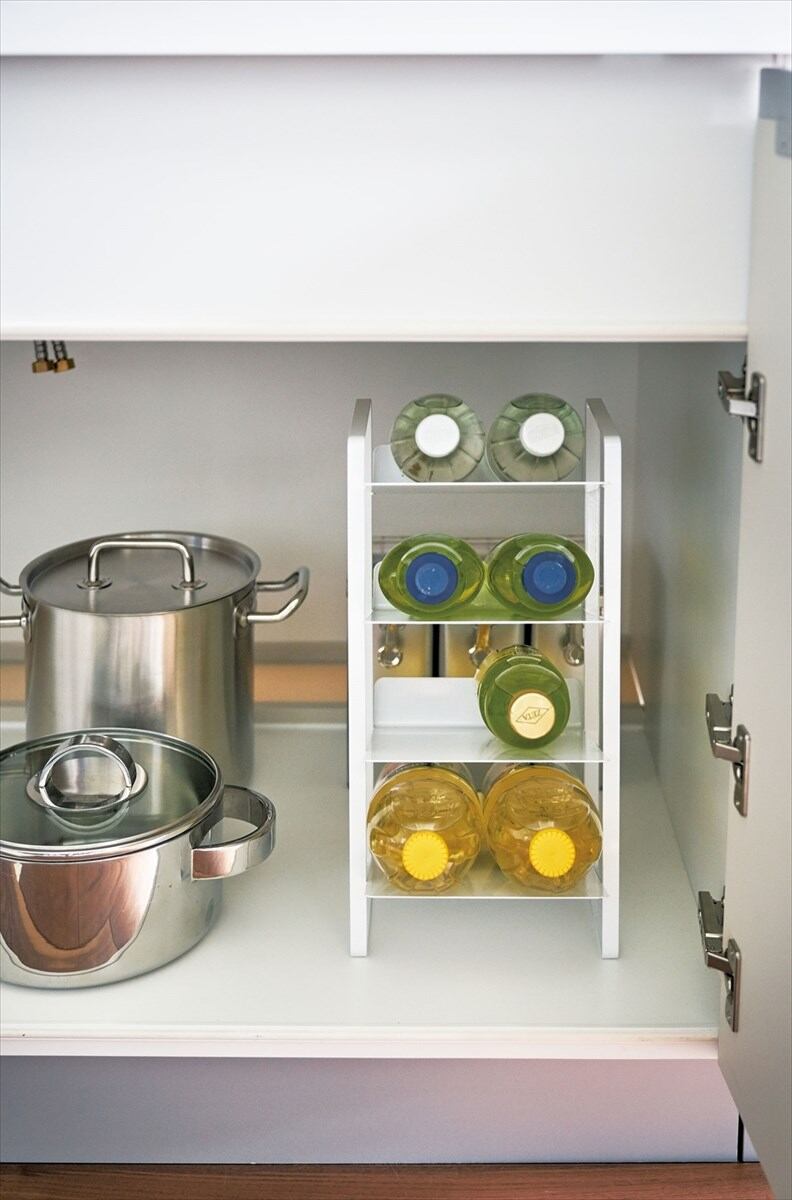キッチン・洗面下収納で使える!便利で取り出しやすいボトルストッカー。調味料ボトルやペットボトル、シャンプーボトル、洗剤ボトル、スプレー缶まで幅広く収納可能な4段ストッカー。約8本のボトルが収納可能です。