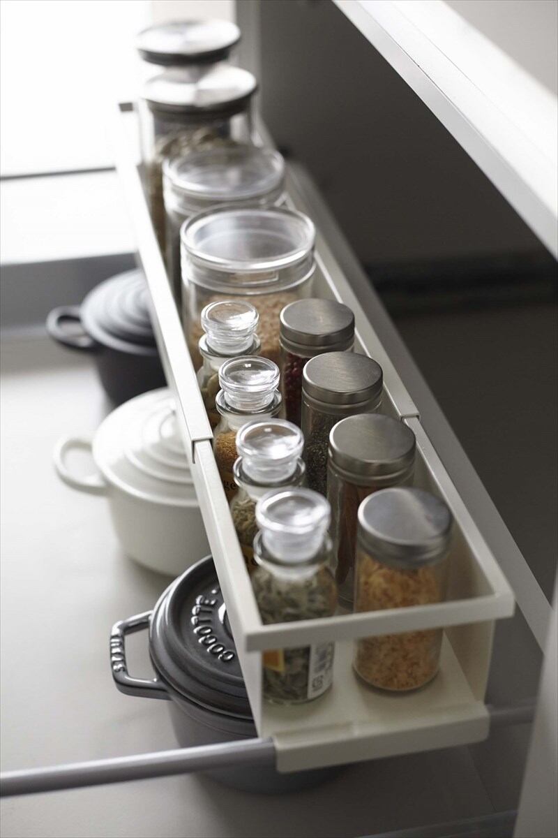 伸縮できるから引き出しの幅に合わせてピッタリフィットする伸縮ラック!引き出しのスペースを2段に分けられます。引き出しのサイドバーに引っ掛けるだけの簡単設置!収納部の奥行は約10cmとスリムなのでスパイスボトルや保存容器などの小物収納に便利!