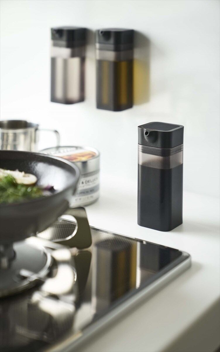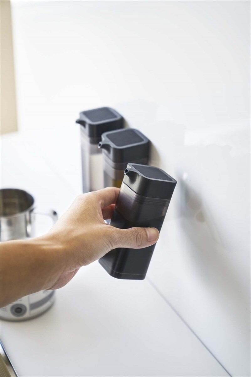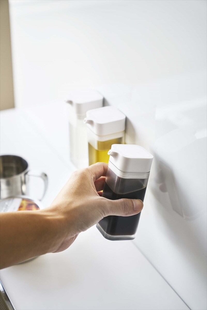 マグネットが付く冷蔵庫やパネルに簡単取り付けの調味料容器シリーズ。 ワンプッシュで少しずつ注げる醤油差し。