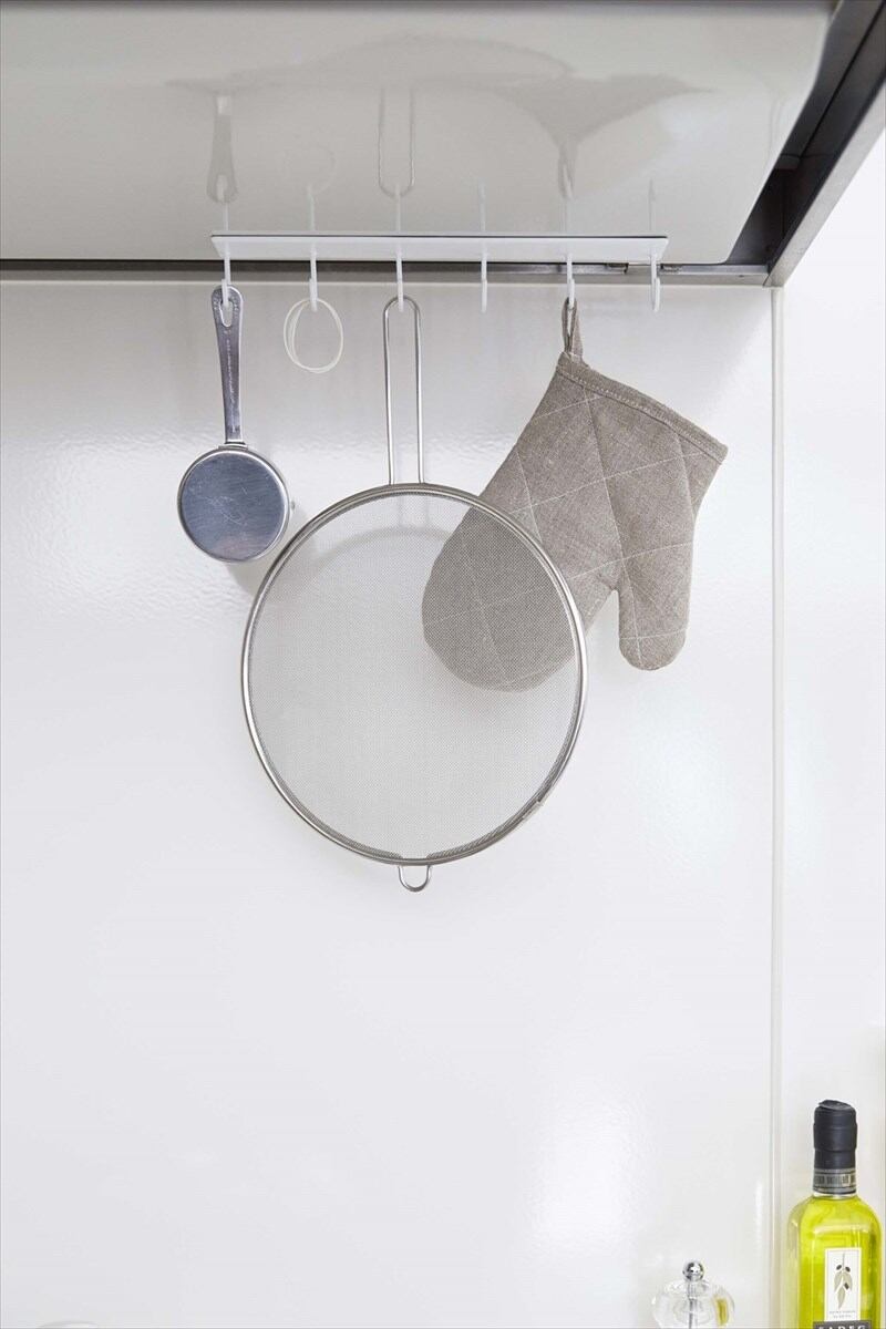 レンジフードのスチールカバー面に(整流板)マグネットで簡単取り付けのキッチンツールフック。調理道具・鍋つかみ・計量スプーンなど、よく使うキッチンツールを掛けておくのに便利!スチール棚板の裏面にも取り付け可能。 レンジフードの整流板にマグネットで簡単取り付け。調理道具・鍋つかみ・計量スプーンなどの収納に便利。