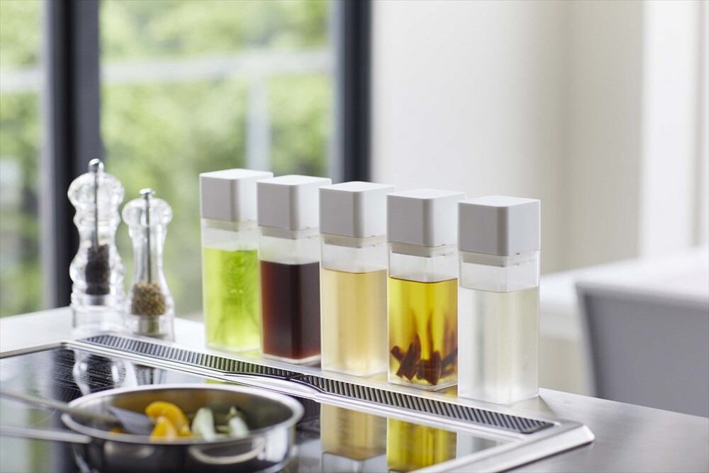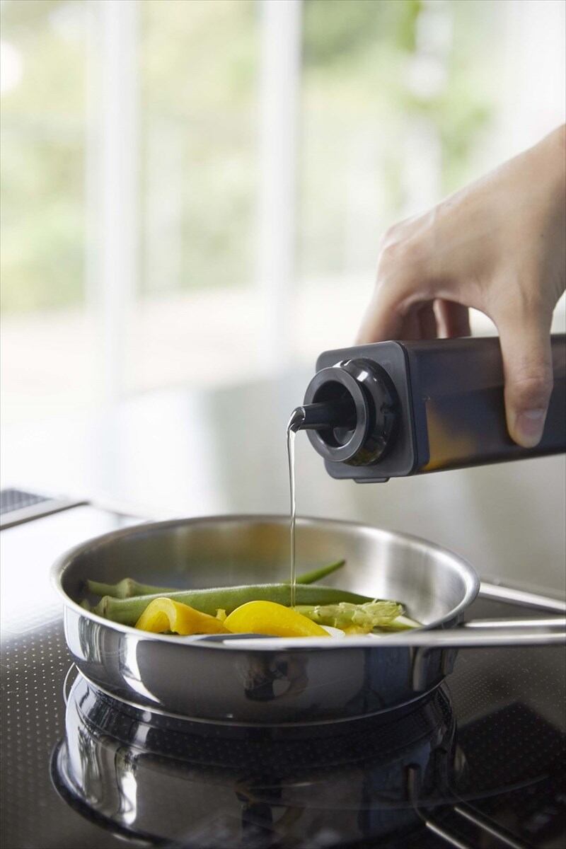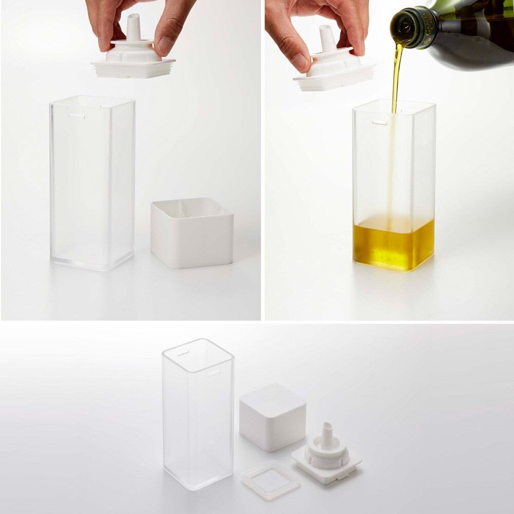 醤油、みりん、酒、酢、油などの調味料を入れ替えてすっきり整理整頓できるボトル。 蓋を軽くひねるだけの簡単オープン。閉めるときはワンプッシュ。キャップは密閉されているので、倒れてもこぼれる心配がありません。卓上でも調理時でも大活躍。
