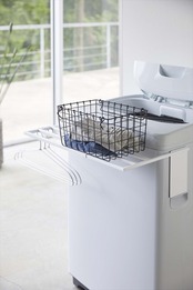 マグネットで洗濯機側の面に挟み込むだけの簡単取り付け!バスタオル・バスマットをスリムに干せます。 使わないときはサッと取り付け替えれば邪魔になりません。風呂上がりの着替えや洗濯カゴなどの一時置き棚としても。
