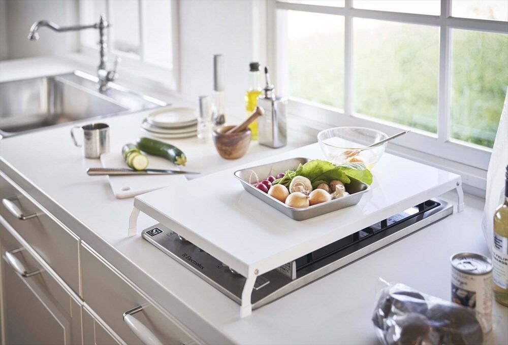 ガスコンロの上が収納&作業スペースに早変わり!簡単設置のコンロカバー。 前後並びの2口ビルトインガスコンロや3口ガスコンロの上をまとめてカバー。コンロ上に設置して収納・作業スペースになる便利なアイテム。脚部はストッパー付きで倒れにくい構造です。