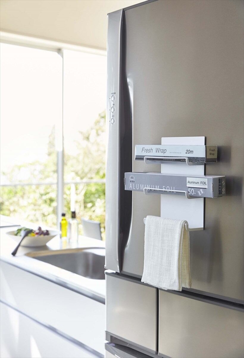 強力マグネットで冷蔵庫にくっつけるだけ!ラップやホイルを置くだけの簡単収納!フリーザーバッグなどの大きめのボックスも収納可能!取り出しやすいシンプルな構造。タオルなどを掛けて使用できます。