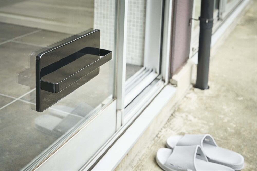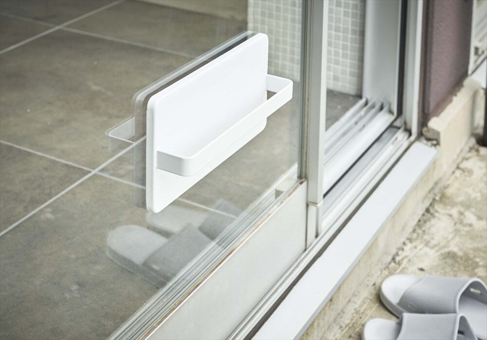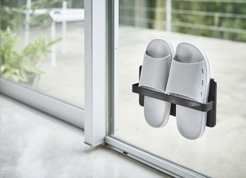 雨や風を避けてベランダスリッパを室内の窓や扉に吸盤で付けて簡単収納!付属の木ネジで壁にも取り付けられます。ベランダの外側に取り付けても便利です。